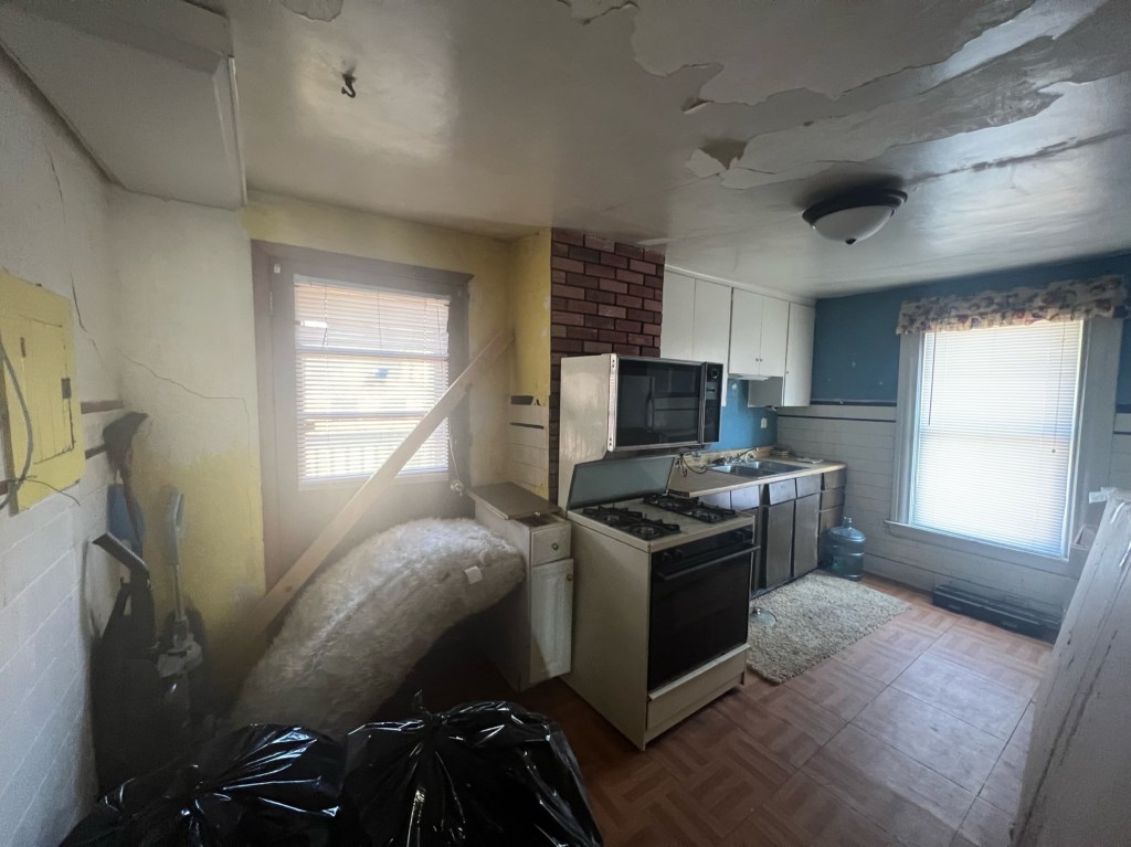 Another issue is that there are no outlets near the countertops. I doubt that the kitchen had ever been wired to code, so this room will need to be completely rewired.