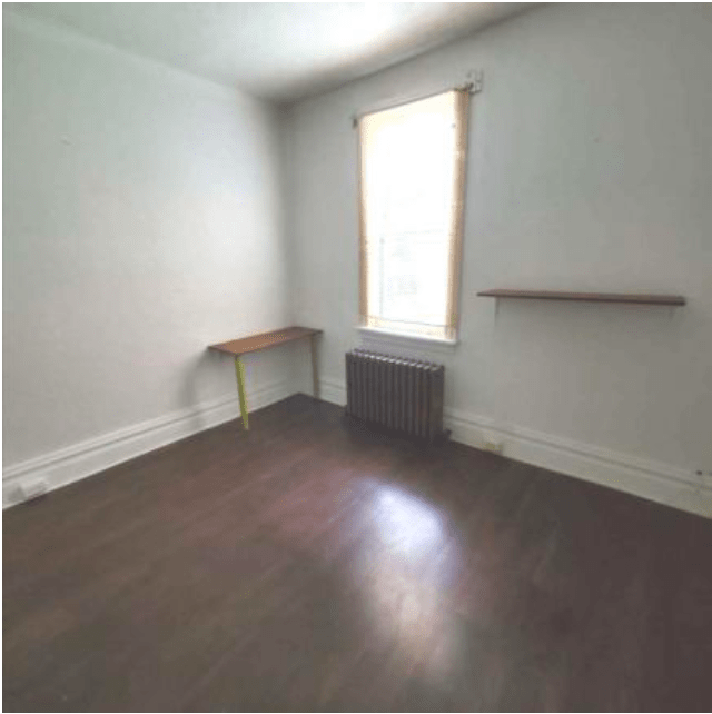 The kitchen in this house is outdated and in need of updating, as you could imagine. The countertop space in the kitchen is separated by a radiator and window, and have no outlets. The drop ceiling doesn’t help its look much either.